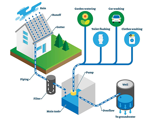 Rainwater harvesting is the simple process or technology used to conserve rainwater by collecting, storing, conveying and purifying of rainwater that runs off from rooftops, parks, roads, open grounds, etc. for later use.
